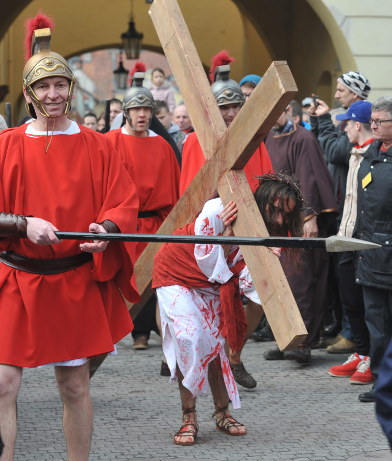 Ježiš, ktorého hrá Matúš Jurko (vpravo) počas živého zobrazenia poslednej cesty Ježiša Krista na Veľký piatok v rámci Veľkonočných sviatkov. Zobrazenia autentických zastavení Krížovej cesty začali na Hlavnej ulici a vyvrcholili ukrižovaním a pochovaním Ježiša Krista v Záhrade umenia. Prešov, 30. marec 2018. Foto: SITA/Viktor Zamborský.