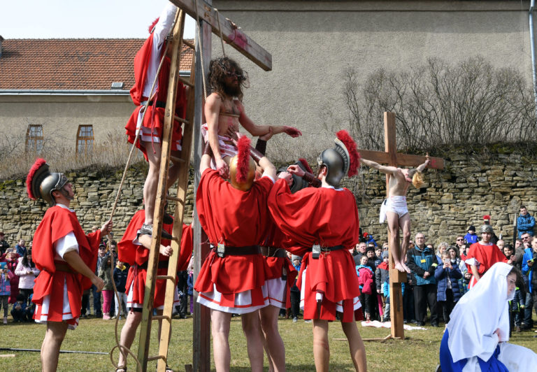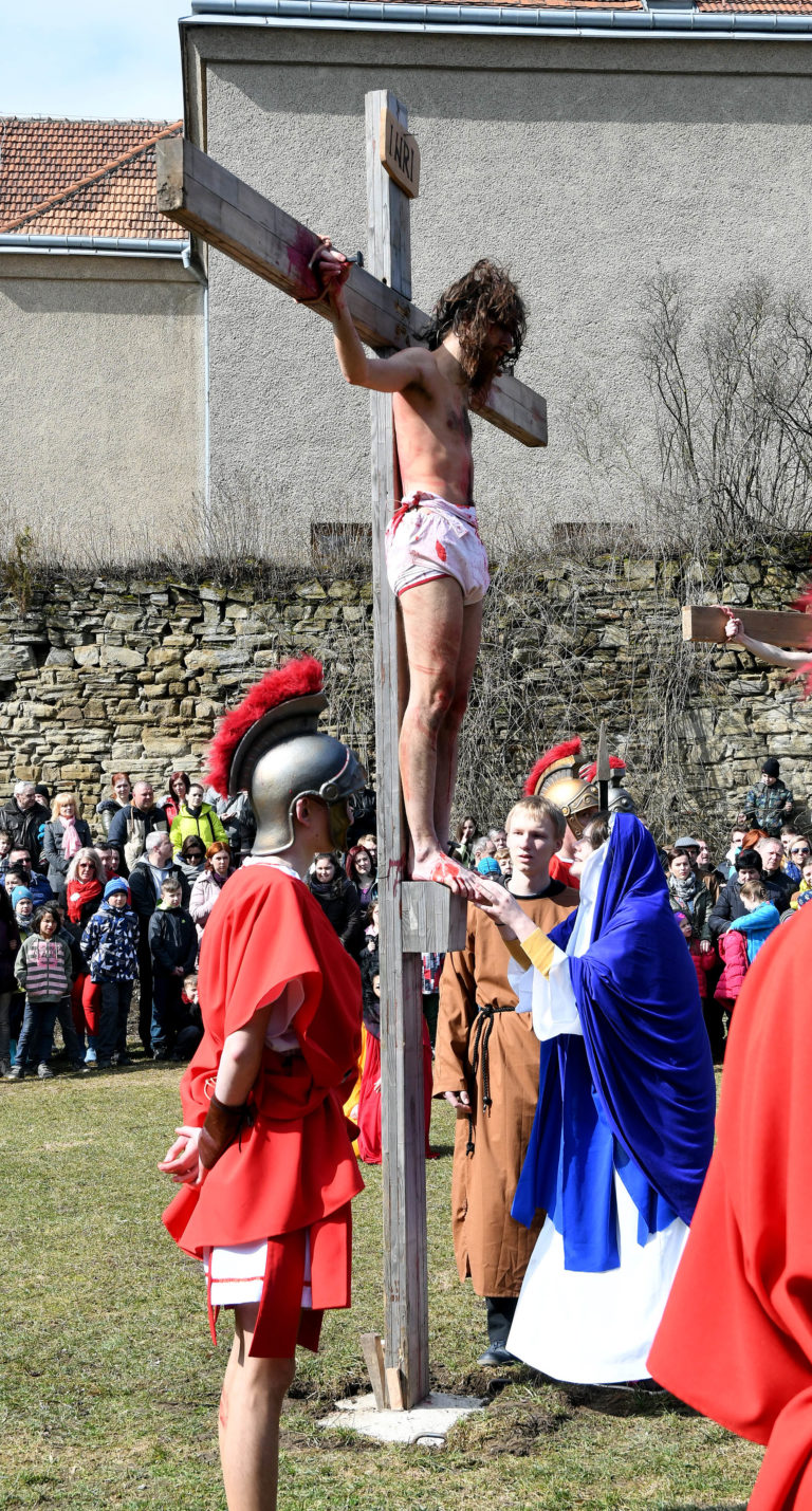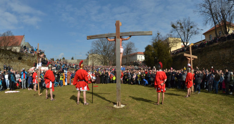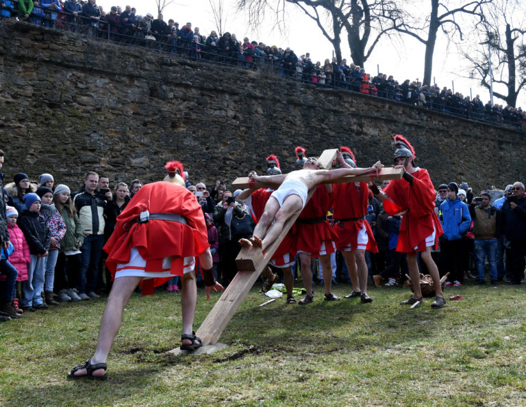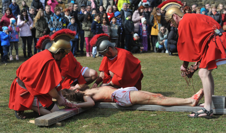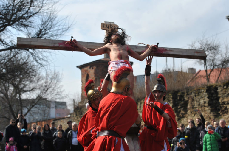 Ukrižovanie počas živého zobrazenia poslednej cesty Ježiša Krista na Veľký piatok v rámci Veľkonočných sviatkov. Zobrazenia autentických zastavení Krížovej cesty začali na Hlavnej ulici a vyvrcholili ukrižovaním a pochovaním Ježiša Krista v Záhrade umenia. Prešov, 30. marec 2018. Foto: SITA/Viktor Zamborský.