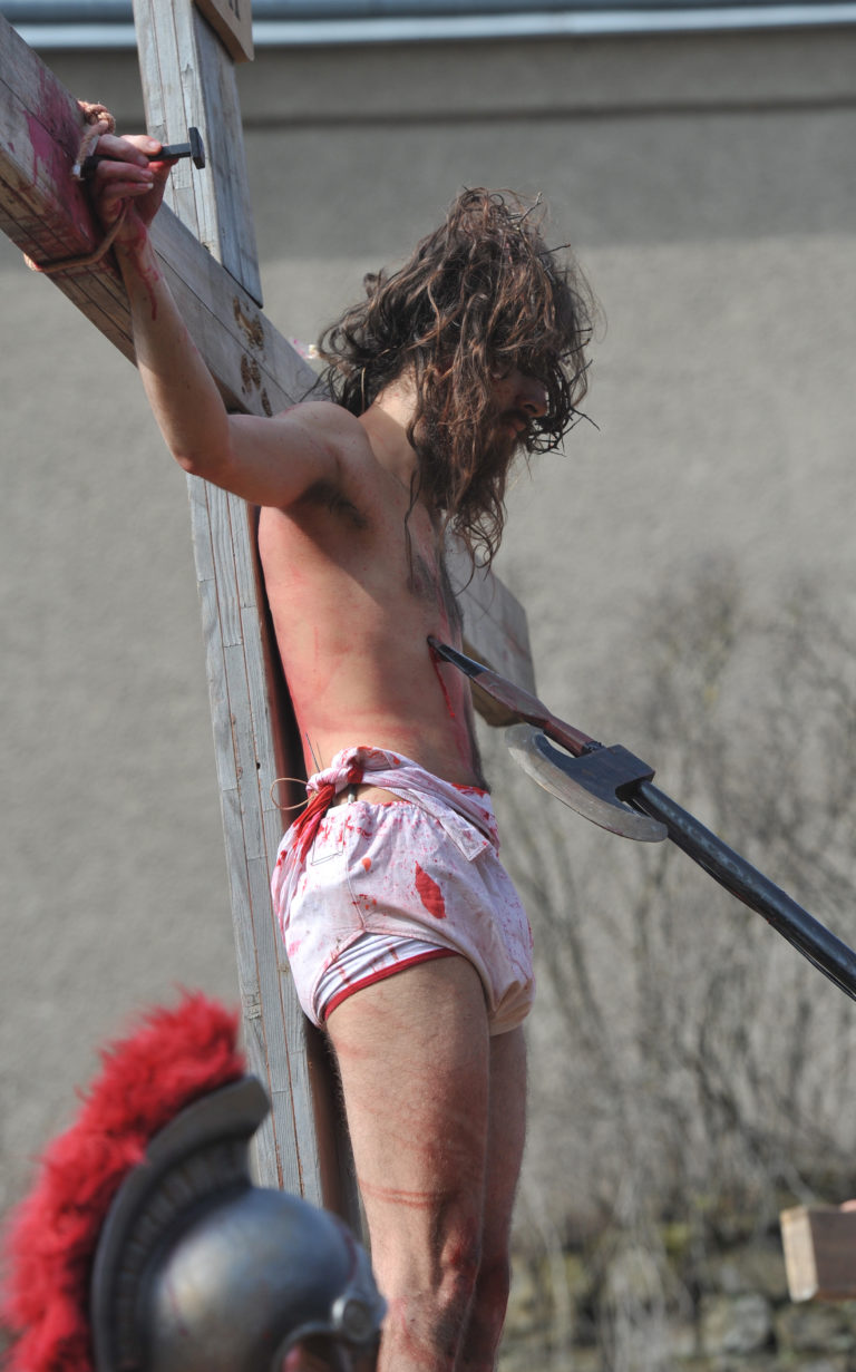 Ježiš, ktorého hrá Matúš Jurko (na kríži vpravo) počas živého zobrazenia poslednej cesty Ježiša Krista na Veľký piatok v rámci Veľkonočných sviatkov. Zobrazenia autentických zastavení Krížovej cesty začali na Hlavnej ulici a vyvrcholili ukrižovaním a pochovaním Ježiša Krista v Záhrade umenia. Prešov, 30. marec 2018. Foto: SITA/Viktor Zamborský.