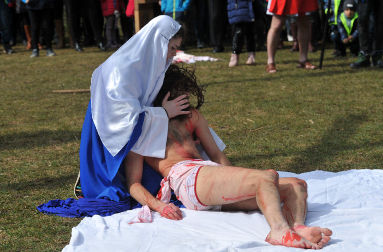 Zľava: Ježišova matka Mária, ktorú hrá Laura Krehlíková a Ježiš, hrá ho Matúš Jurko počas živého zobrazenia poslednej cesty Ježiša Krista na Veľký piatok v rámci Veľkonočných sviatkov. Zobrazenia autentických zastavení Krížovej cesty začali na Hlavnej ulici a vyvrcholili ukrižovaním a pochovaním Ježiša Krista v Záhrade umenia. Prešov, 30. marec 2018. Foto: SITA/Viktor Zamborský.