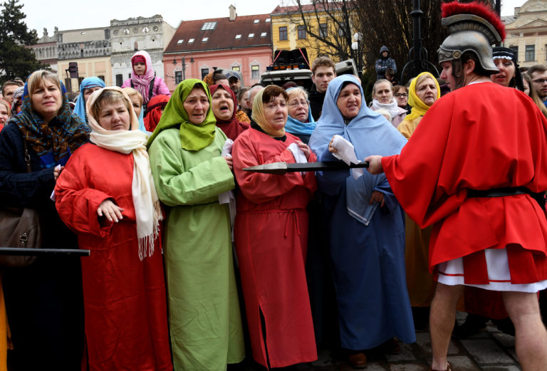 Ženy sledujú súd s Ježišom počas živého zobrazenia poslednej cesty Ježiša Krista na Veľký piatok v rámci Veľkonočných sviatkov. Zobrazenia autentických zastavení Krížovej cesty začali na Hlavnej ulici a vyvrcholili ukrižovaním a pochovaním Ježiša Krista v Záhrade umenia. Prešov, 30. marec 2018. Foto: SITA/Viktor Zamborský.
