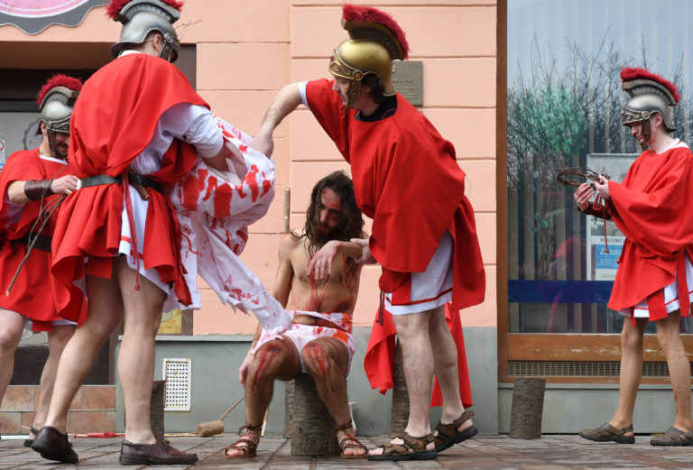 Bičovanie Ježiša, ktorého hrá Matúš Jurko (uprostred) počas živého zobrazenia poslednej cesty Ježiša Krista na Veľký piatok v rámci Veľkonočných sviatkov. Zobrazenia autentických zastavení Krížovej cesty začali na Hlavnej ulici a vyvrcholili ukrižovaním a pochovaním Ježiša Krista v Záhrade umenia. Prešov, 30. marec 2018. Foto: SITA/Viktor Zamborský.