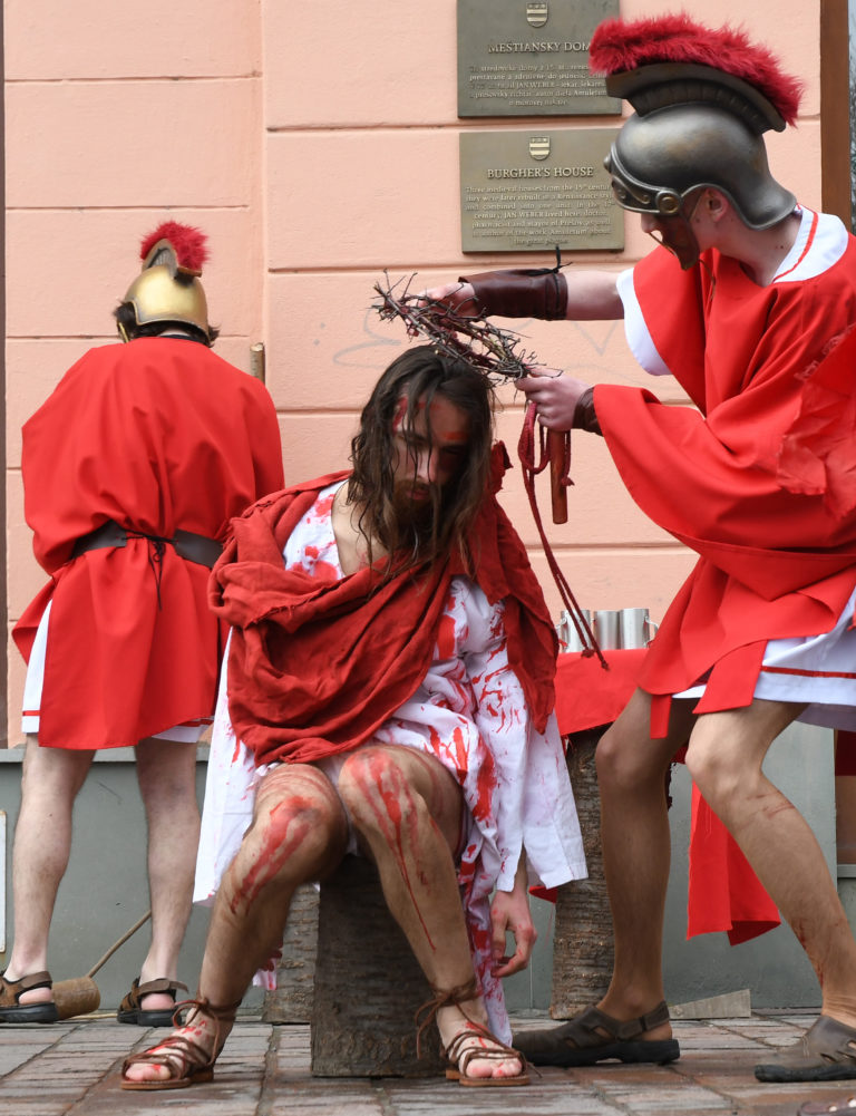 Korunovanie Ježiša, ktorého hrá Matúš Jurko (uprostred) počas živého zobrazenia poslednej cesty Ježiša Krista na Veľký piatok v rámci Veľkonočných sviatkov. Zobrazenia autentických zastavení Krížovej cesty začali na Hlavnej ulici a vyvrcholili ukrižovaním a pochovaním Ježiša Krista v Záhrade umenia. Prešov, 30. marec 2018. Foto: SITA/Viktor Zamborský.
