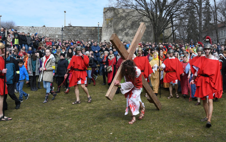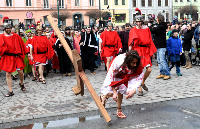 Ježiš, ktorého hrá Matúš Jurko (uprostred dole) počas živého zobrazenia poslednej cesty Ježiša Krista na Veľký piatok v rámci Veľkonočných sviatkov. Zobrazenia autentických zastavení Krížovej cesty začali na Hlavnej ulici a vyvrcholili ukrižovaním a pochovaním Ježiša Krista v Záhrade umenia. Prešov, 30. marec 2018. Foto: SITA/Viktor Zamborský.