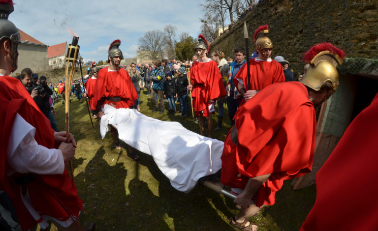 Vojaci ukladajú telo Ježiša Krista do hrobu počas živého zobrazenia poslednej cesty Ježiša Krista na Veľký piatok v rámci Veľkonočných sviatkov. Zobrazenia autentických zastavení Krížovej cesty začali na Hlavnej ulici a vyvrcholili ukrižovaním a pochovaním Ježiša Krista v Záhrade umenia. Prešov, 30. marec 2018. Foto: SITA/Viktor Zamborský.