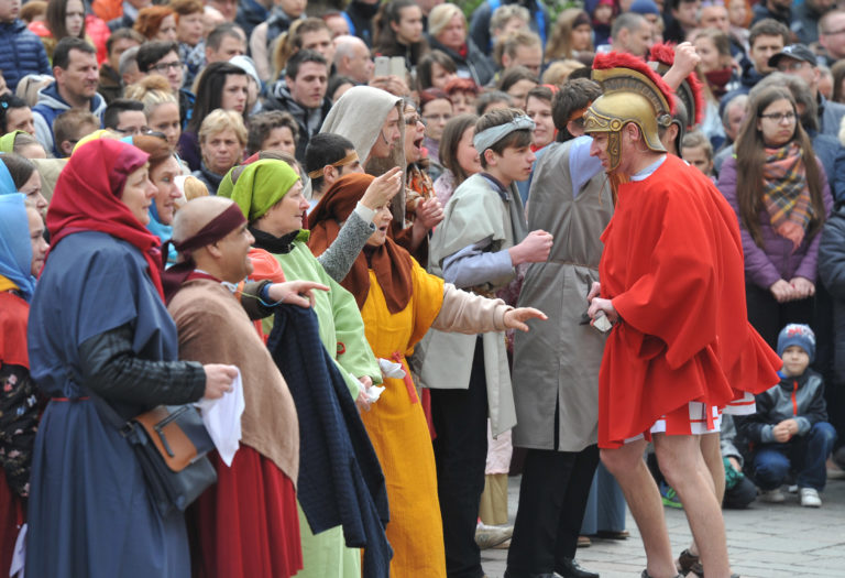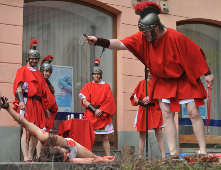 Ján Jendrichovský (vľavo) ako Ježiš Kristus počas živej krížovej cesty na Hlavnej ulici v Záhrade umenia v Prešove. Prešov, 14. apríl 2017. Foto: SITA/Viktor Zamborský