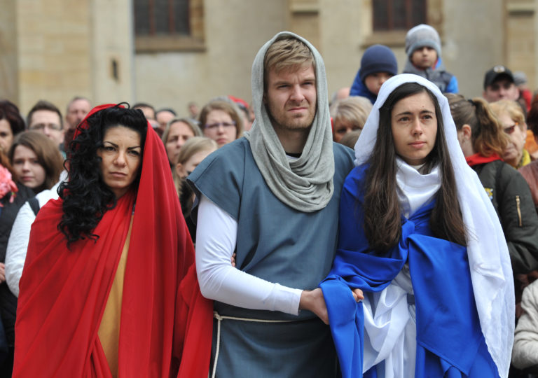 Živá krížová cesta na Hlavnej ulici v Záhrade umenia v Prešove. Prešov, 14. apríl 2017. Foto: SITA/Viktor Zamborský