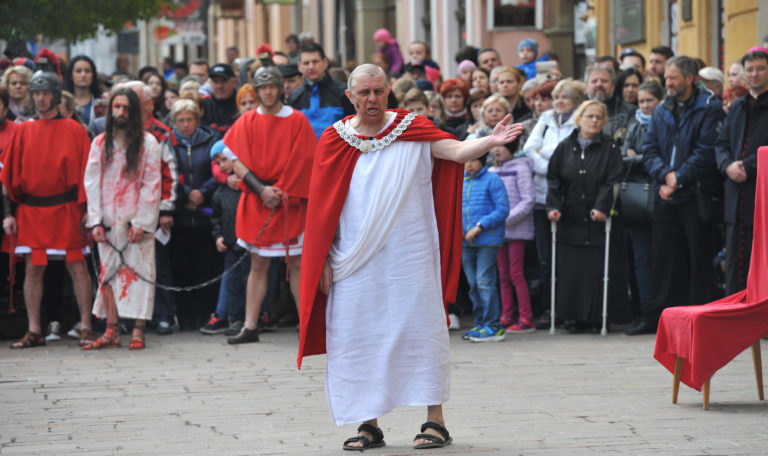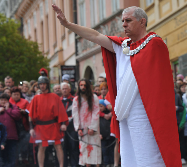 Pilát Pontský počas živej krížovej cesty na Hlavnej ulici v Záhrade umenia v Prešove. Prešov, 14. apríl 2017. Foto: SITA/Viktor Zamborský
