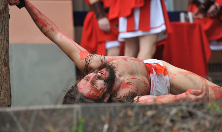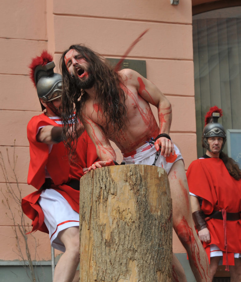 Ján Jendrichovský ako Ježiš Kristus počas živej krížovej cesty na Hlavnej ulici v Záhrade umenia v Prešove. Prešov, 14. apríl 2017. Foto: SITA/Viktor Zamborský