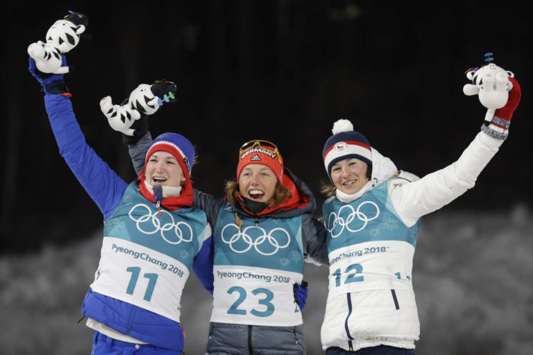 Zlatá medailistka Laura Dahlmeier z Nemecka, vstrede, strieborná medailistka Marte Olsbu z Nórska,vľavo a bronzová víťazka Veronika Vitkova z českej republiky počas ZOH 2018 v Pjongčangu. 10. február 2018 Foto: SITA/AP