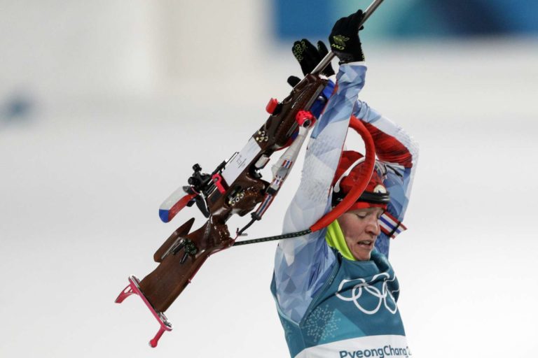 Anais Bescond z Francúzska počas biatlonových pretekov na ZOH 2018 v Pjongčangu. 10. február 2018 Foto: SITA/AP