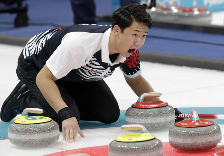 Juhokórejčan Lee Kijeong kričí pokyny svojmu partnerovi počas zápasu v curlingu na ZOH 2018 v Pjongčangu. Foto: SITA/AP