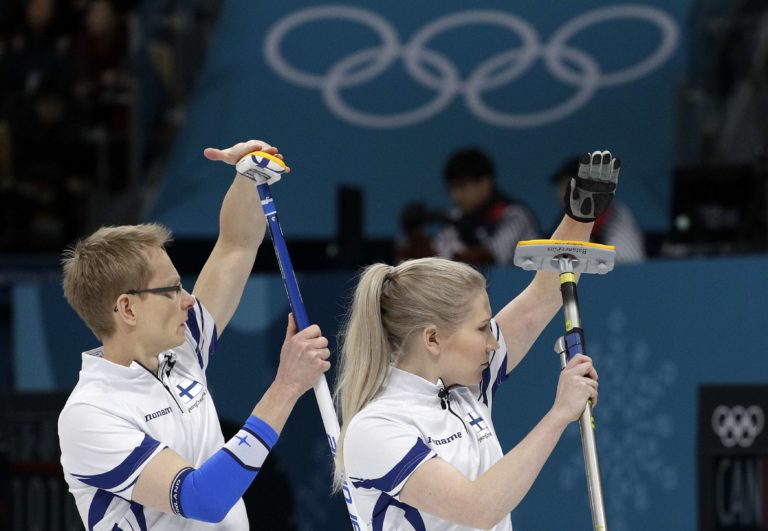 Fínsky miešaný pár Tomi Rantamaeki, vpravo a Oona Kauste žiadajú o timeout počas zápasu v curlingu na ZOH 2018 v Pjongčangu. Foto: SITA/AP