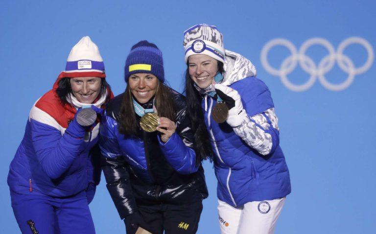 Olympijské medailistky z behu na lyžiach zľava: Nórka Marit Bjoergenov, striebro, Švédka Charlotte Kallaová, zlato a Fínka Krista Parmakoski, bronz. ZOH 2018 v Pjongčangu. 10. február 2018 Foto: SITA/AP