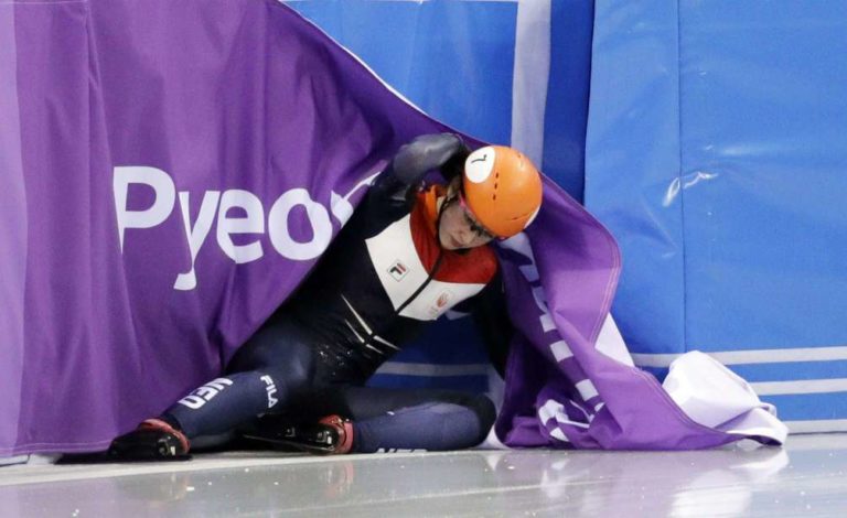 Suzanne Schulting z Holandska spadla počas pretekov na 500 v short track na ZOH 2018 v Pjongčangu. 10. február 2018 Foto: SITA/AP