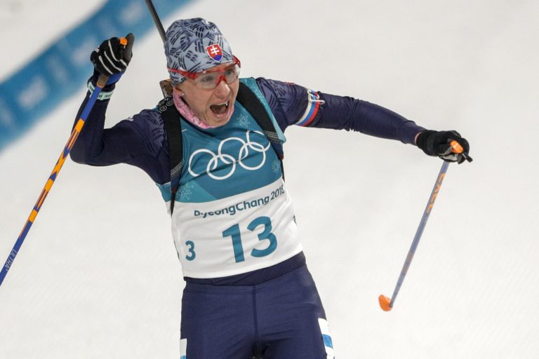 Slovenská biatlonistka v cieli stíhacích pretekov na ZOH 2018 v Pjongčangu, v ktorých obsadila druhé miesto a získala striebornú medailu. Pjongčang, 12. február 2018. Foto: SITA/AP.
