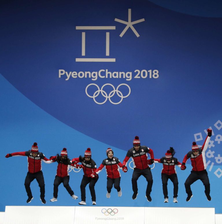 Tím kanadských krasokorčuliarov počas odovzdávania medailí na ZOH 2018 v Pjongčangu. Foto: SITA/AP