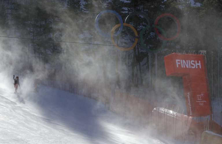 Silný vietor v cieli obrovského slalomu žien. Pjongčang, 12. február 2018. Foto: SITA/AP.