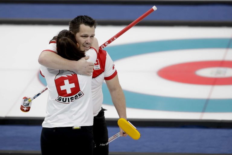 Jenny Perret a Martin Rios zo Švajčiarska počas curlingového zápasu na ZOH 2018 v Pjongčangu. 12. február 2018 Foto: SITA/AP