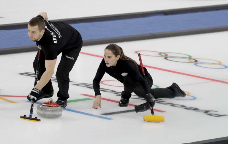 Aleksandr Krushelnitckii a Anastasia Bryzgalova počas curlingového zápasu na ZOH 2018 v Pjongčangu. 12. február 2018 Foto: SITA/AP