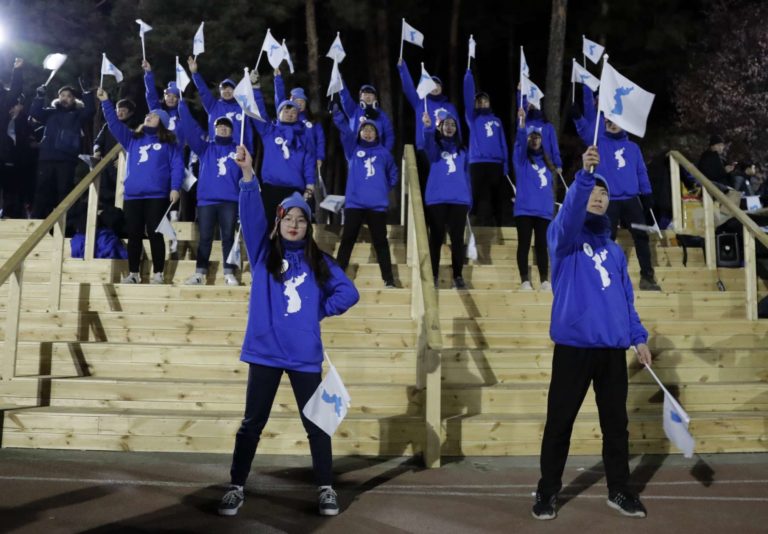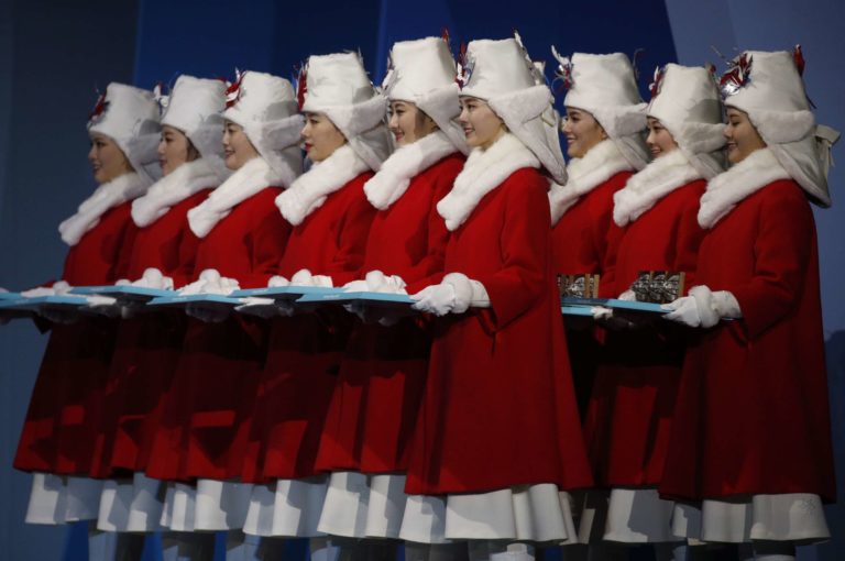 Skupina roztlieskavačiek pred hokejovým zápasom Švédiek a Kórejčanok na ZOH 2018 v Pjongčangu. 12. február 2018 Foto: SITA/AP