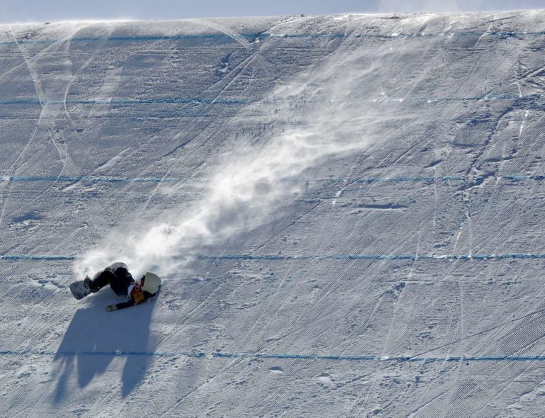 Snoubordistka Reira Iwabuchi z Japonska padá počas slopestylu na ZOH 2018 v Pjongčangu. 12. február 2018 Foto: SITA/AP