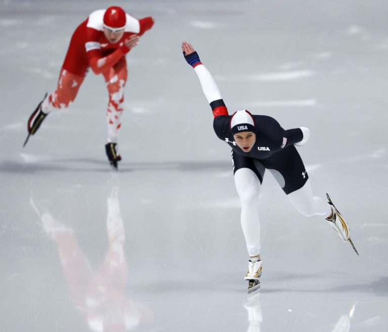 Brittany Bowe z USA, vpravo a Natalia Czerwonka z Poľska, vľavo počas ZOH 2018 v Pjongčangu. 12. február 2018