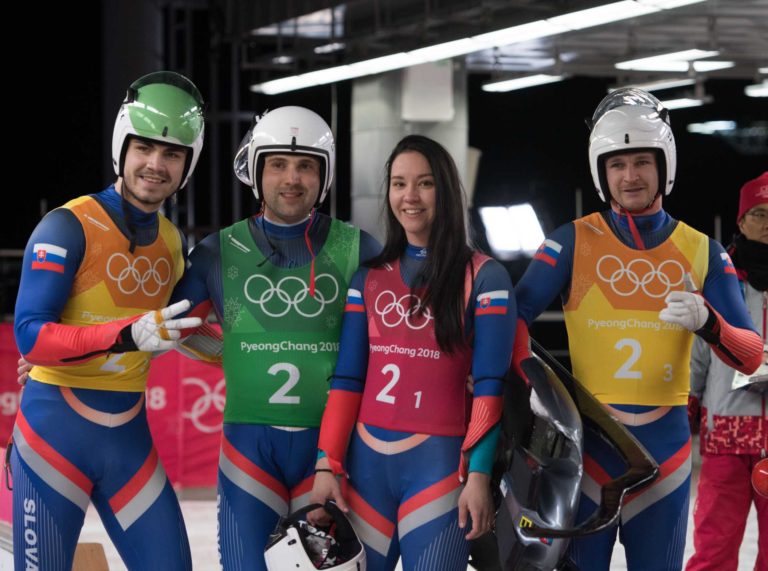 Slovenskí reprezentanti v sánkovaní, zľava: Marek Solčanský, Jozef Ninis, Katarína Šimoňáková a Karol Stuchlák počas tímovej súťaže sánkarov na ZOH 2018 v juhokórejskom Pjongčangu. Kórejská republika, Pjongčang, 15. február 2018. Foto: SITA/Martin Medňanský