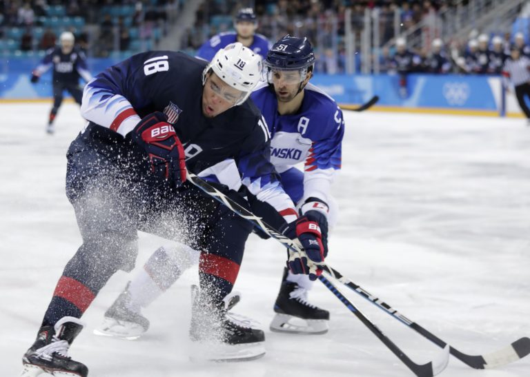 Slovenský obranca Dominik Graňák v súboji s Američanom Jordanom Greenwayom počas zápasu na ZOH 2018. Pjongčang, 16. február 2018. Foto: SITA/AP.