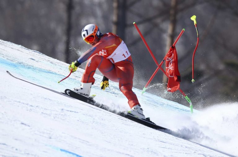 Aleksander Aamodt Kilde z Nórska stratil počas svojej jazdy na ZOH 2018 v Pjongčangu lyžiarsku palicu. 16. február 2018 Foto: SITA/AP