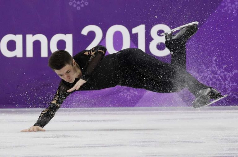 Yaroslav Paniot z Ukrajiny padá počas svojho programu na ZOH 2018 v Pjongčangu. 16. február 2018 Foto: SITA/AP