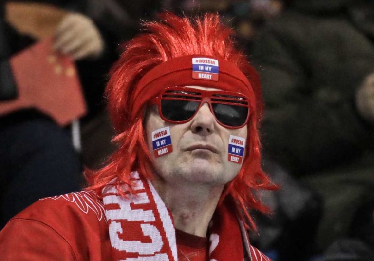 Ruský fanúšik sleduje mužskú krasokorčuliarsku súťaž na ZOH 2018 v Pjongčangu. 16. február 2018 Foto: SITA/AP