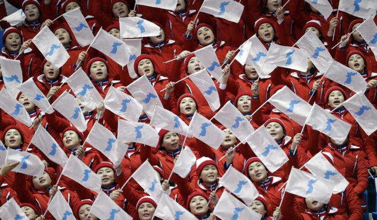 Fanúšikovia zo Severnej Kórey počas súťaže v krasokorčuľovaní. Foto: SITA/AP