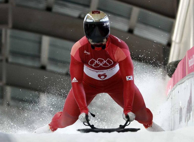 Kórejčan Jun Sung-bin počas jednej zo svojich jázd v skeletone mužov na XXIII. zimných olympijských hrách v juhokórejskom Pjongčangu. Pjongčang, 16. február 2018. Foto: SITA/AP.
