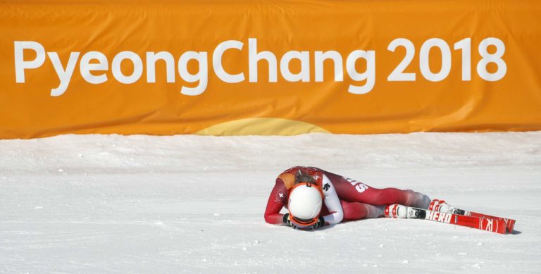 Michelle Gisin zo Švajčiarska padla počas zjazdu na ZOH 2018 v Pjongčangu- 21. február 2018 Foto: SITA/AP