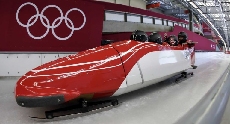Švajčiarski štvorbob Rico Peter, Michael Kuonen, Simon Friedli and Thomas Amrhein na začiatku svojej tréningovej jazdy na ZOH 2018 v Pjongčangu. 21. február 2018 Foto: SITA/AP