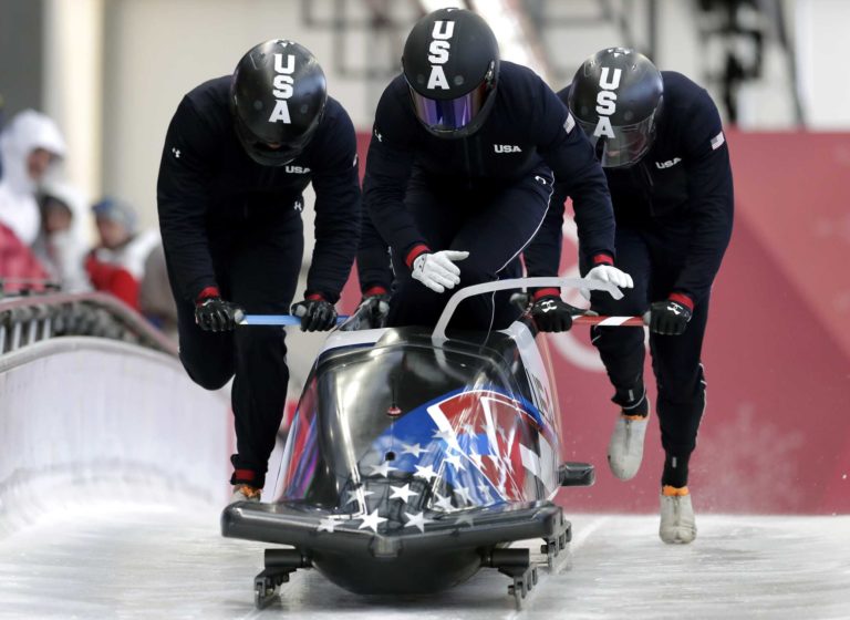 Američania Nick Cunningham, Hakeem Abdul-Saboor, Christopher Kinney, Samuel Michner na začiatku svojej tréningovej jazdy na ZOH 2018 v Pjongčangu. 21. február 2018 Foto: SITA/AP