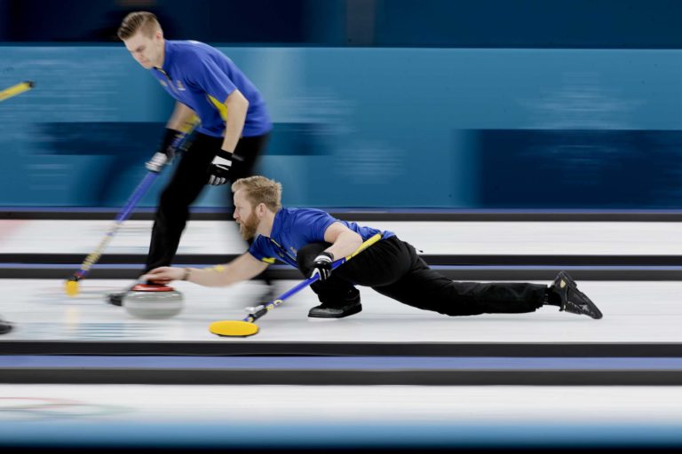 Niklas Edin zo Švédska púšťa kameň počas curlingového zápasu na ZOH 2018 v Pjongčangu. 21. február 2018 Foto: SITA/AP