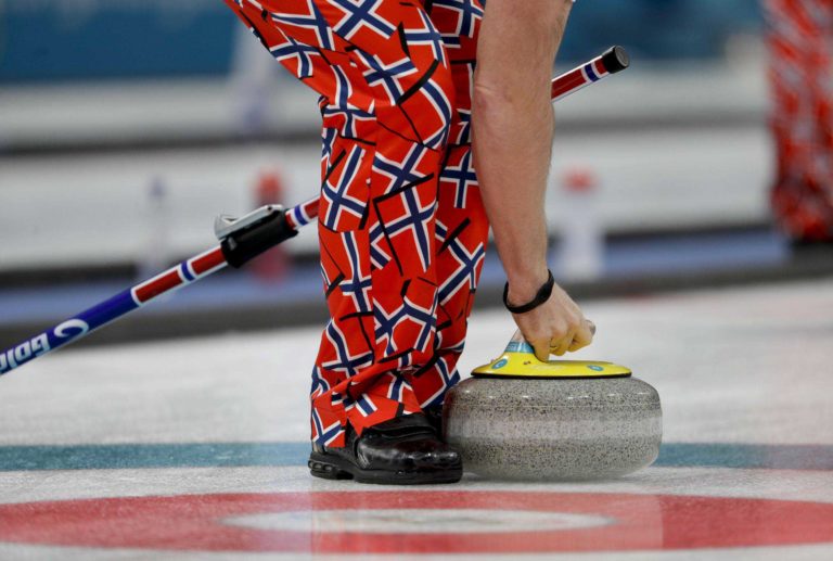 Christoffer Svae z Nórska počas curlingového zápasu proti Južnej Kórei na ZOH 2018 v Pjongčangu. 21. február 2018 Foto: SITA/AP