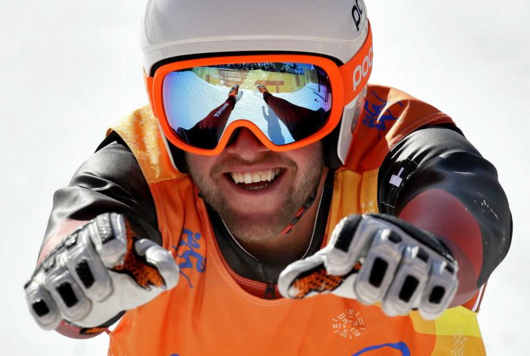 Strieborný medailista Marc Bischofberger zo Švajčiarska oslavuje triumf na ZOH 2018 v Pjongčangu. 21. február 2018 Foto: SITA/AP