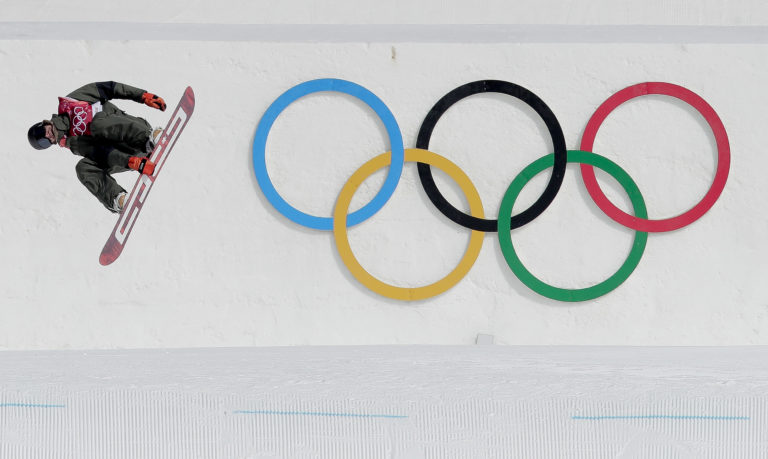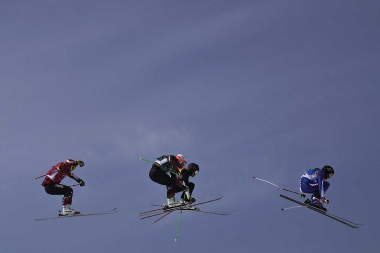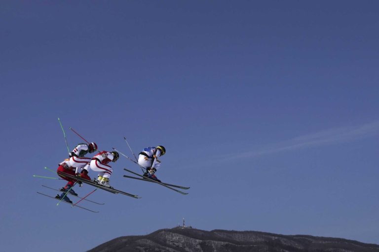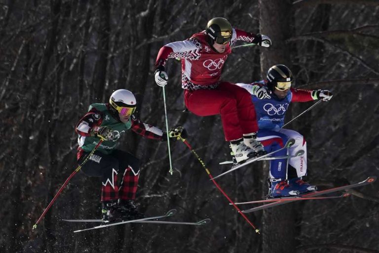 Kanaďan Christopher Del Bosco, vpravo letí pred pádom počas pretekov na ZOH 2018 v Pjongčangu. 21. február 2018 Foto: SITA/AP