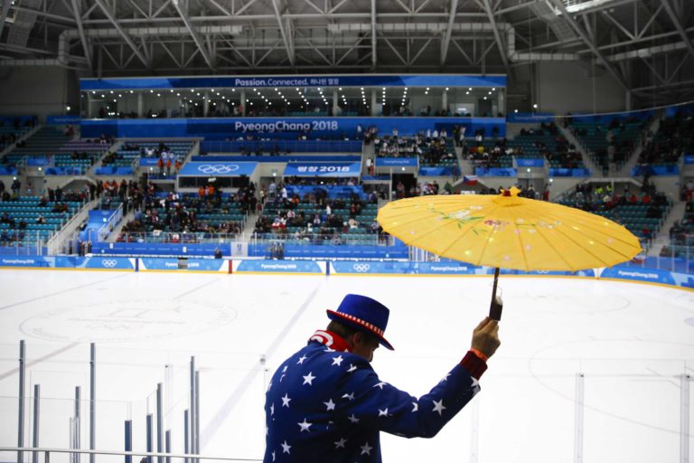 Eric Cobb ide pomedzi sedačky s dáždnikom pred zápasom USA - Česko na ZOH 2018 v Pjongčangu. 21. február 2018 Foto: SITA/AP