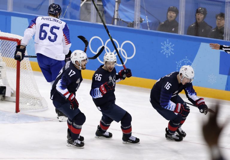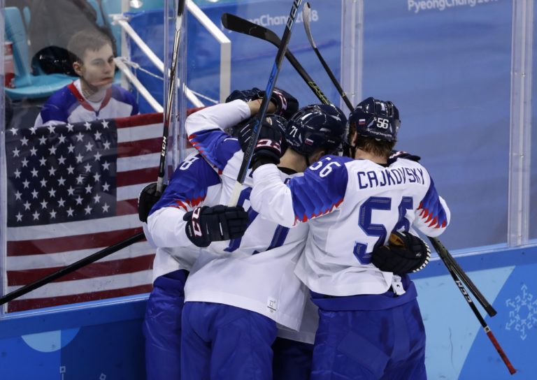 Radosť amerických hokejistov po triumfe nad Slovenskom v zápase ZOH 2018. Pjongčang, 16. február 2018. Foto: SITA/AP.
