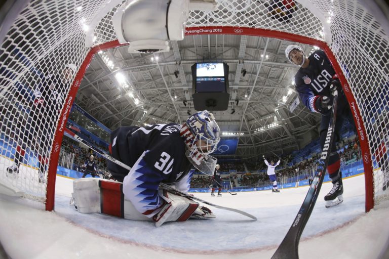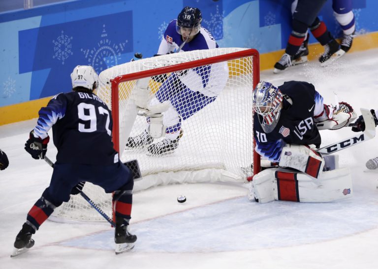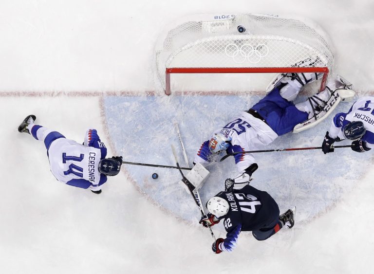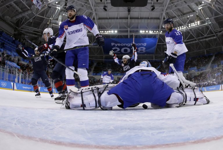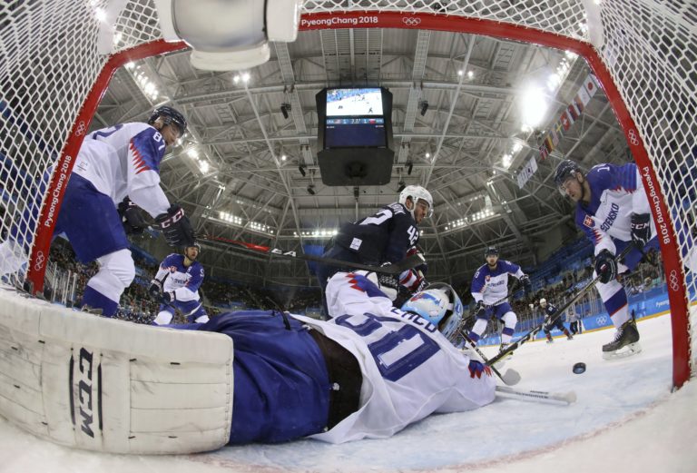 Puk z hokejky slovenského útočníka Andreja Kudrnu končí za chrbtom amerického brankára Ryana Zapolského počas zápasu na ZOH 2018. Pjongčang, 16. február 2018. Foto: SITA/AP.