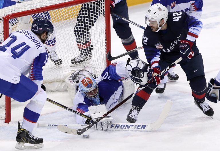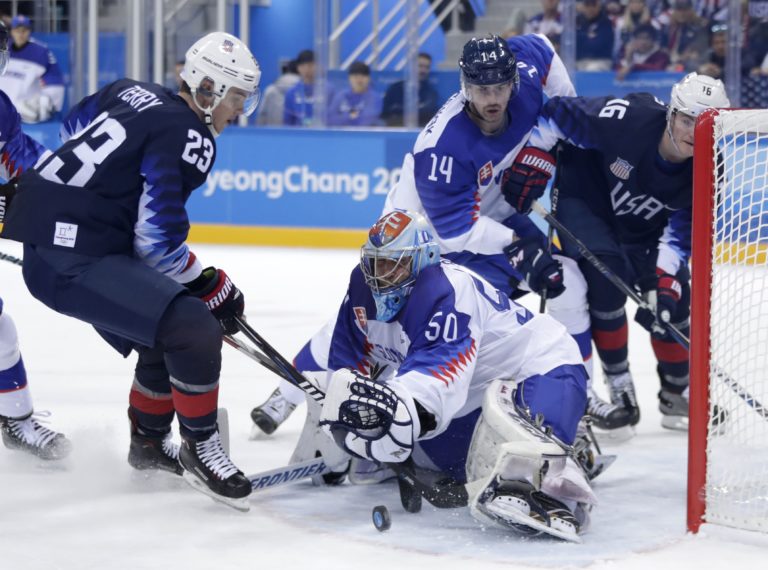 Američan Chad Kolarik (42) sa snaží prekonať slovenského gólmana Jána Laca počas zápasu na ZOH 2018. Pjongčang, 16. február 2018. Foto: SITA/AP.