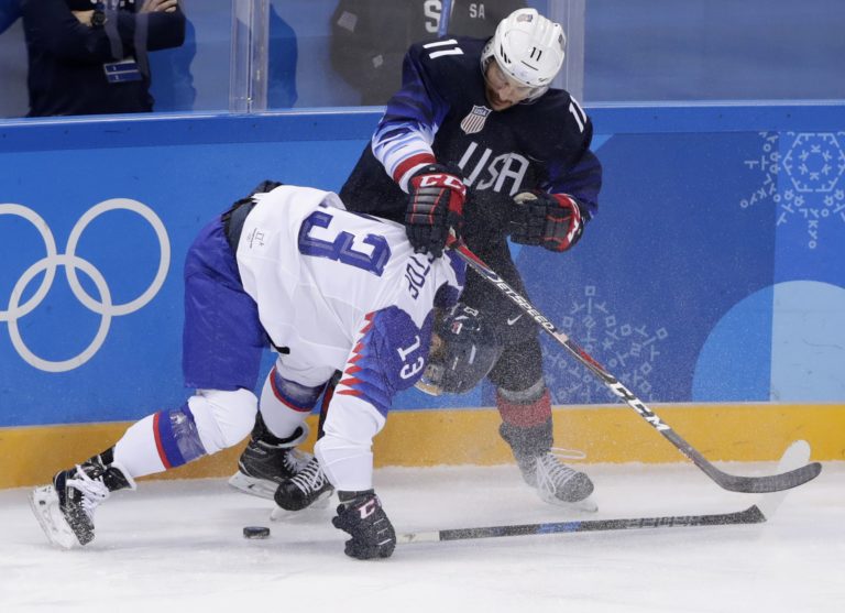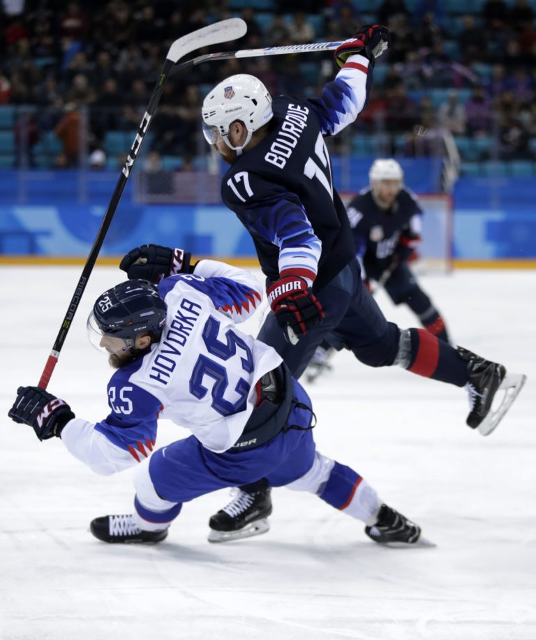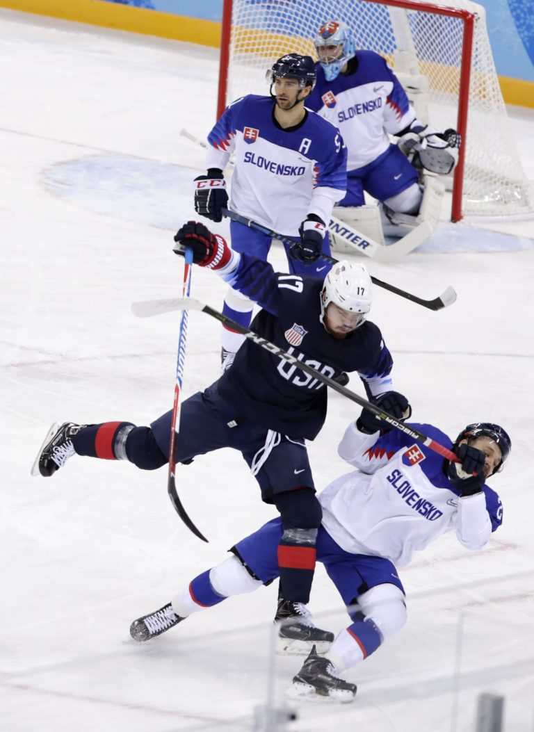 Slovenský útočník Marek Hovorka padá po súboji s Američanom Chrisom Bourqeom počas zápasu na ZOH 2018. Pjongčang, 16. február 2018. Foto: SITA/AP.