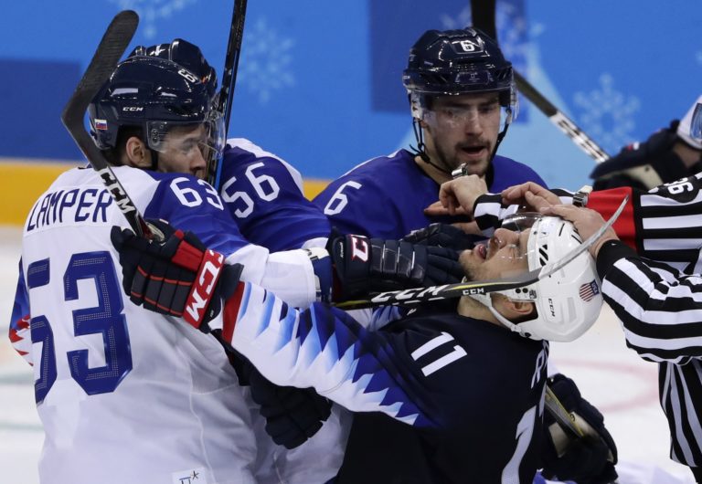 Slovenskí hokejisti v súboji s Američanom Garrettom Roeom počas zápasu na ZOH 2018. Pjongčang, 16. február 2018. Foto: SITA/AP.