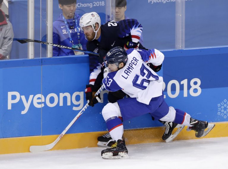"Hit" slovenského útočníka Patrika Lampera na Američana Jamesa Wisniewského počas zápasu na ZOH 2018. Pjongčang, 16. február 2018. Foto: SITA/AP.
