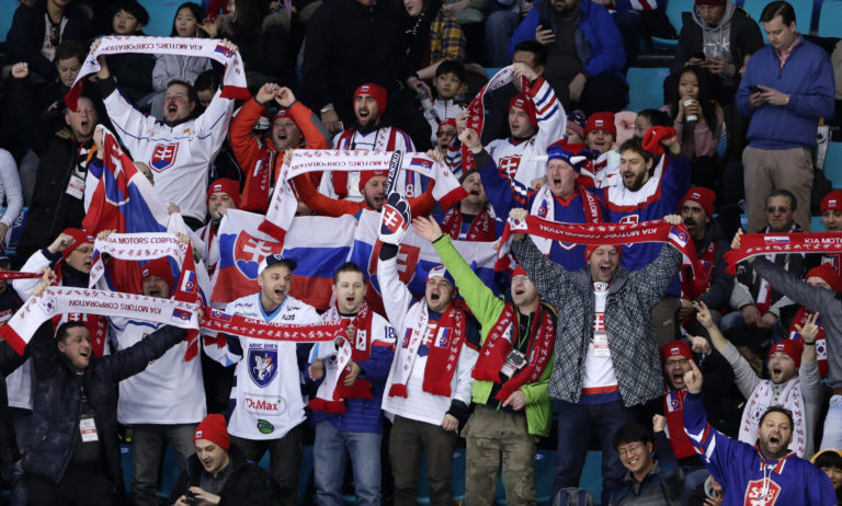 Fanúšikovia počas zápasu Slovensko - USA na zimnej olympiáde v Pjongčangu. Pjongčang, 16. február 2018. Foto: SITA/AP.