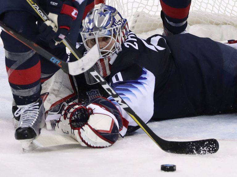 Zákrok amerického brankára Ryana Zapolského počas zápasu proti Slovensku na ZOH 2018. Pjongčang, 16. február 2018. Foto: SITA/AP.